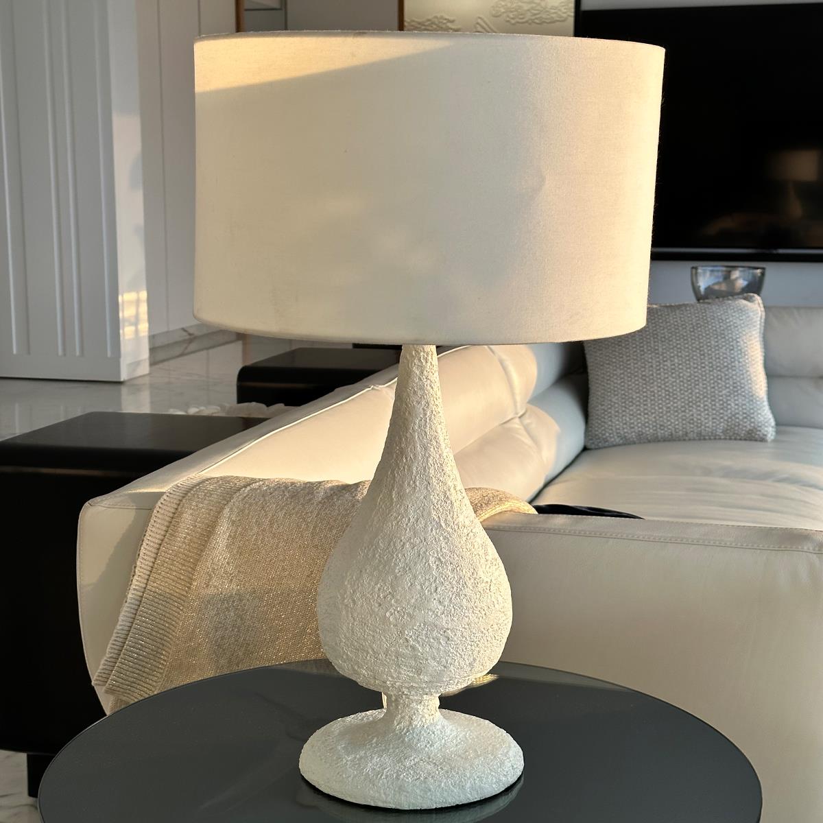 Moonlight – A beautiful minimalistic lamp with a concrete textured base which gives it a very raw and earthly feel at touch. The white color of the fabric creates a gradient and compliments the concrete base. The rough surface enhances the concrete texture adding depth of it, as the light falls on the grains. Despite being made of concrete the lamp is extremely light and easy to lift. The size of the lamp shade is slightly bigger than normal ones, it is best suited for living rooms and other large open areas in your space.
